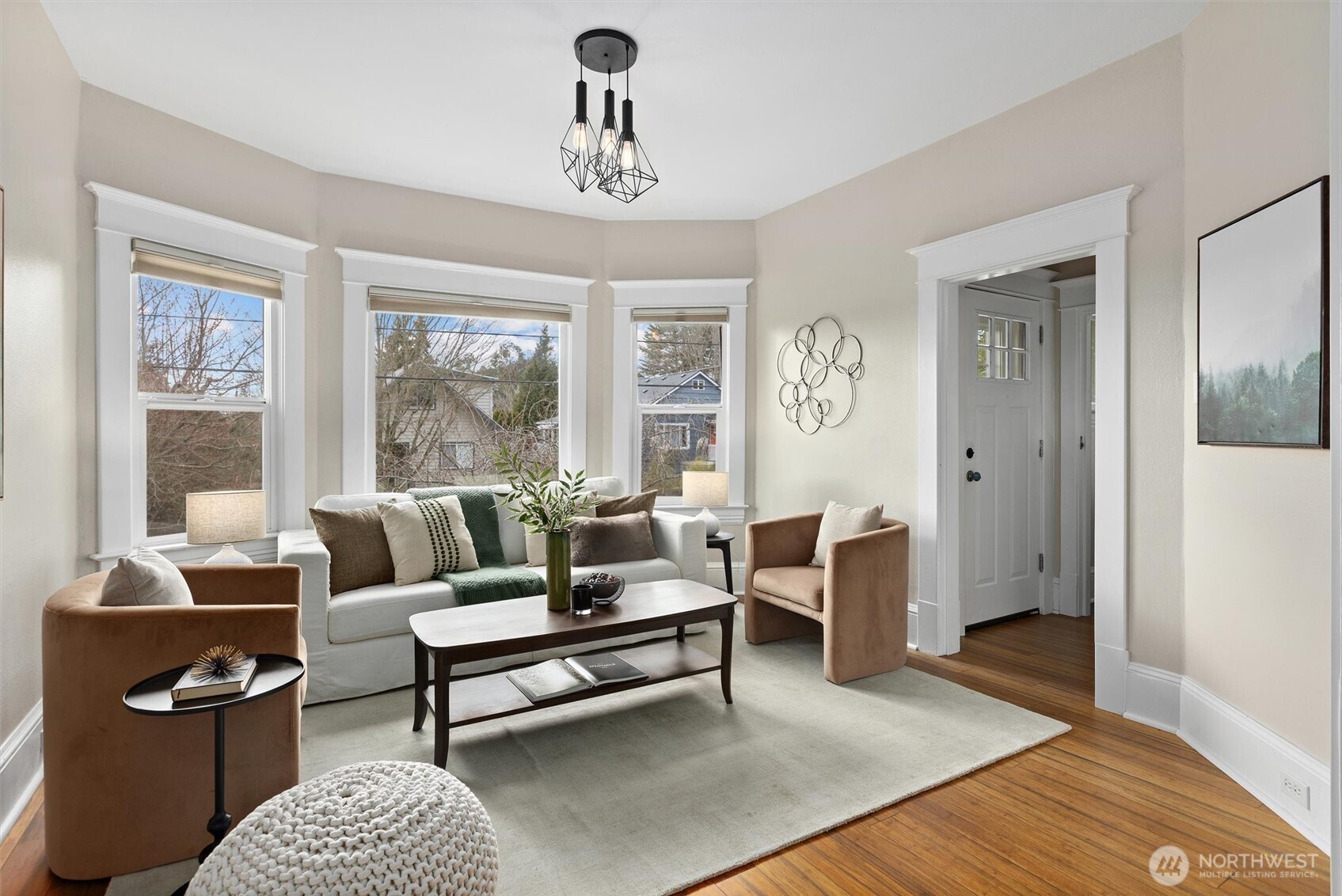 Welcome home to this light and bright Ballard classic that where charm and modern updates seamlessly meet. The main house features 3 beds/2.25 baths with high ceilings, open floor plan, picturesque front bay window, brand new chef's kitchen ('24) w/gas cooking, primary suite with attached bath & walk-in-closet. French doors off dining room lead to spacious deck and fully fenced backyard with low maintenance turf. Lower level includes 2 beds, 3/4 bath, family room & laundry. Detached studio out back provides additional bedroom and bath perfect for home office, guests or Airbnb. Full remodel done in '15 with new roof, furnace and systems. Front yard has patio & garden beds ready for veggies. Close to coffee, parks, eateries & top rated schools.